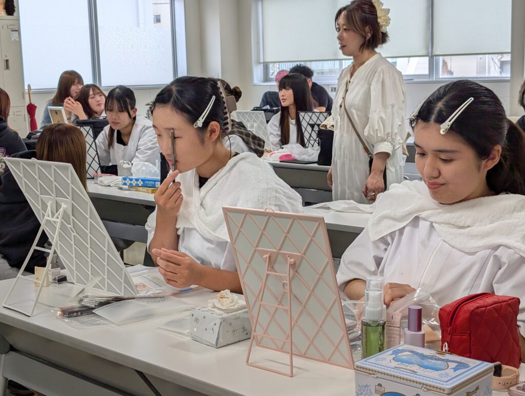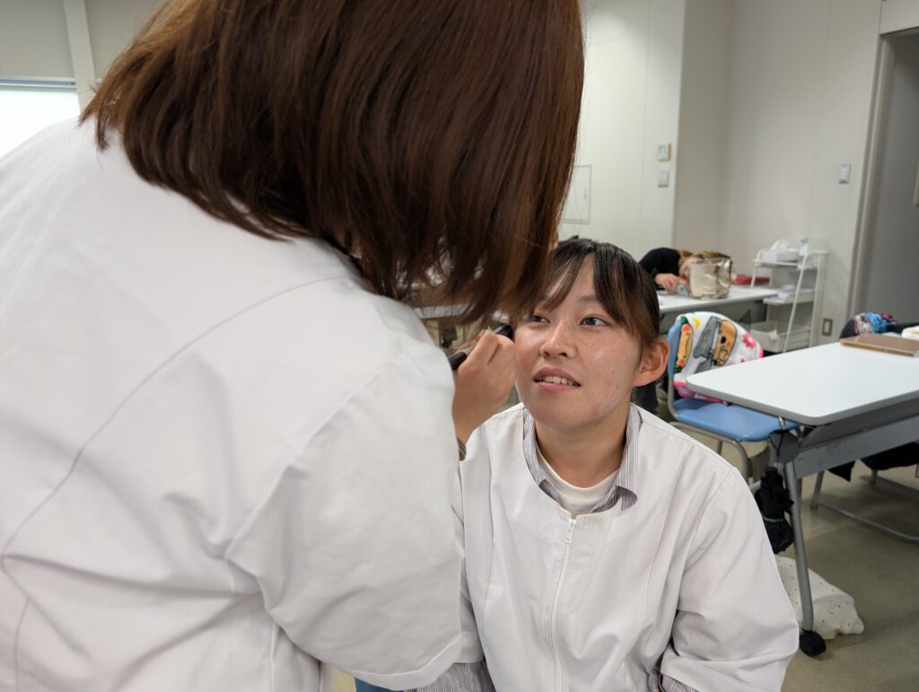 講師は現在美容師であり、ブライダルでも活躍されている中村 聡美先生です。プロならではのテクニックや知識を楽しみながら学んでいます。3回目になりますが、今回はファンデーションの色選び・ファンデーションの塗布の仕方を学びました。